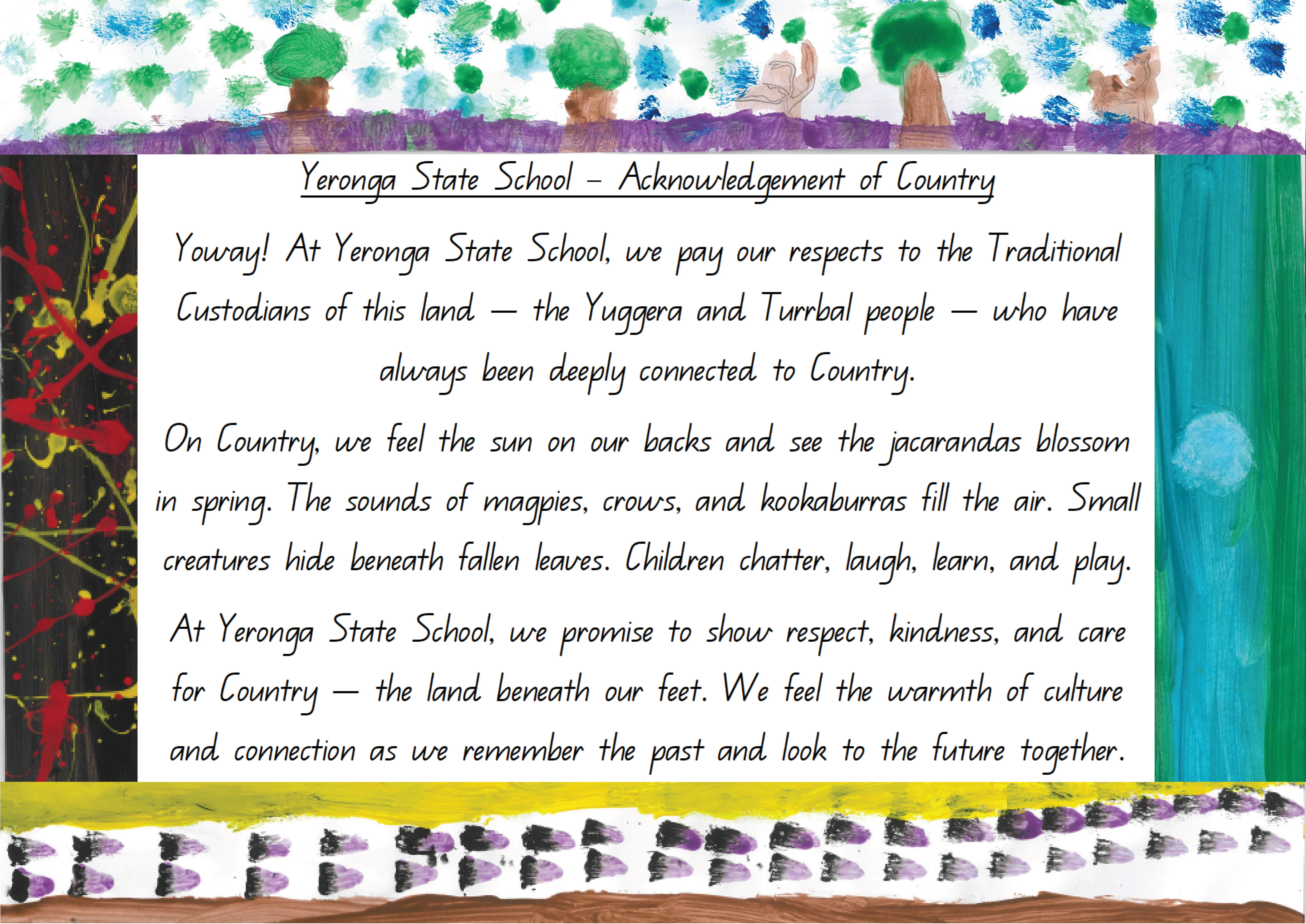 Yoway! At Yeronga State School, we pay our respects to the Traditional Custodians of this land—the Yuggera and Turrbal people—who have always been deeply connected to Country.